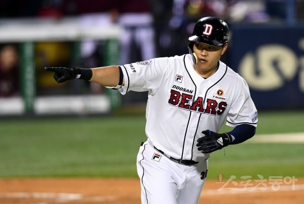 4회말 2사 1루에서 두산 오재일이 우월 동점 투런 홈런을 쏘아 올린 뒤 세리머니를 펼치고 있다.