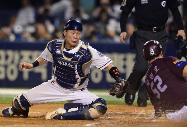 두산 포수 박세혁이 6회초 1사 1,2루에서 키움 송성문의 안타 때 홈으로 쇄도하는 박병호를 태그하기 위해 팔을 뻗고 있다.