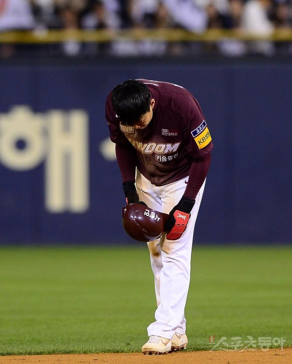 키움 송성문이 6회초 1사 1,2루 상황, 투수 교체 중 두산 선수들에게 고개 숙여 사과를 하고 있다.