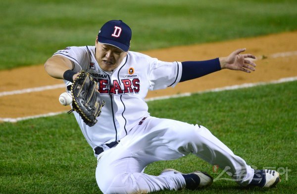 6회초 1사 1,3루 상황에서 두산 오재일이 키움 이지영의 번트 타구를 다이빙캐치했으나 놓치고 있다.