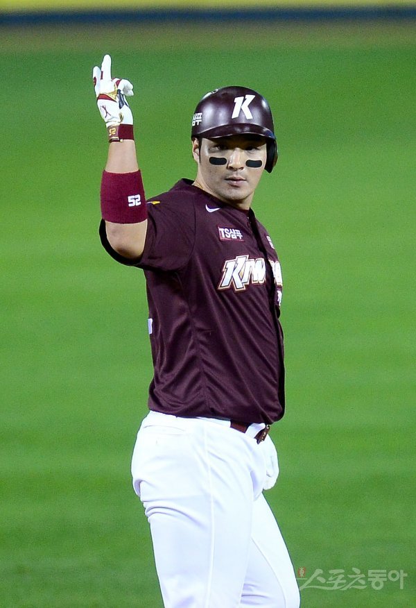 6회초 1사 1루 키움 박병호가 1타점 중전 2루타를 치고 2루에서 기뻐하고 있다.