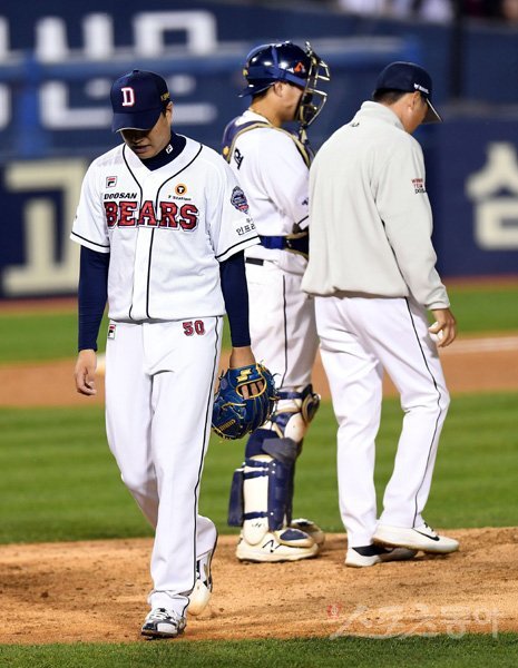 23일 서울 잠실야구장에서 ‘2019 신한은행 MY CAR KBO리그‘ 두산 베어스와 키움 히어로즈의 한국시리즈 2차전 경기가 열렸다. 6회초 1사 1, 3루에서 키움 이지영에게 적시타를 허용한 두산 선발 이영하가 교체되고 있다. 잠실|김민성 기자 marineboy@donga.com
