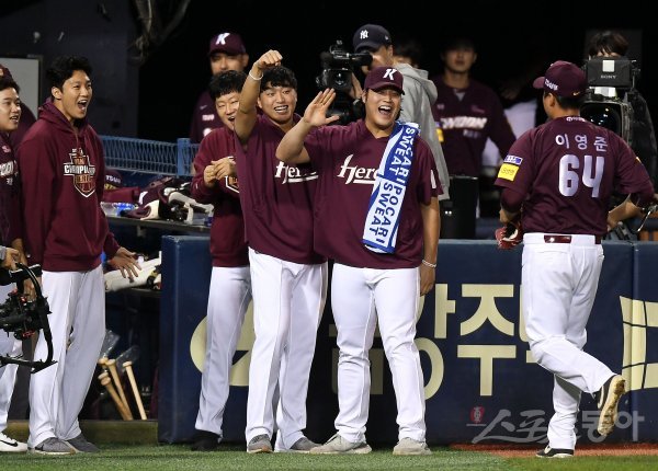 8회말 2사 1, 3루에서 두산 오재일을 삼진 아웃 시킨 키움 이영준이 조상우의 환영을 받고 있다.