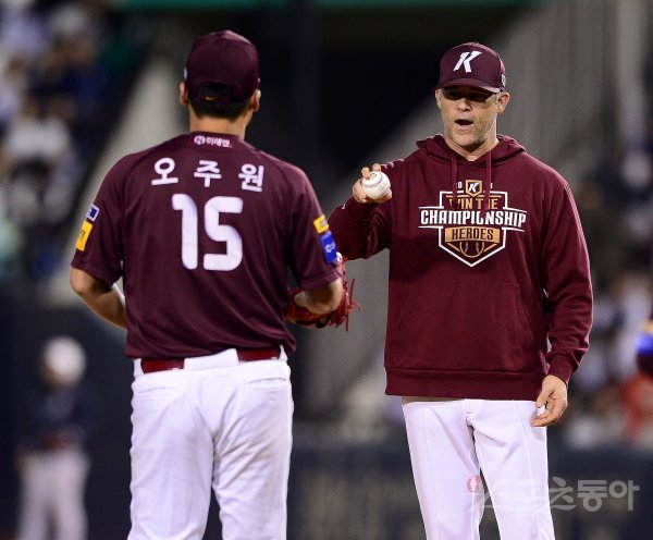 키움 나이트 코치가 9회말 수비를 앞두고 마무리 오주원에게 공을 전달하고 있다.