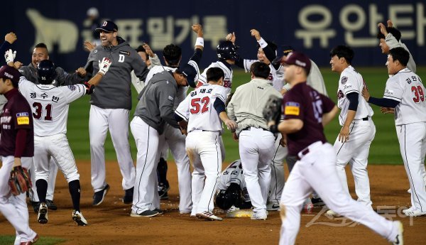 9회말 1사 2루에서 두산 박건우가 끝내기 안타를 날린 뒤 선수들이 환호하고 있다.