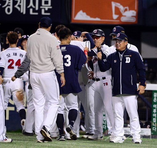 23일 서울 잠실야구장에서 열린 ‘2019 신한은행 MY CAR KBO 포스트시즌’ 한국시리즈 2차전 키움 히어로즈와 두산 베어스의 경기에서 두산이 9회말 터진 박건우의 끝내기 안타에 힘입어 6-5로 승리하며 시리즈 전적 2승을 기록했다. 경기 후 두산 김태형 감독을 비롯한 코칭스테프들이 선수들과 하이파이브를 하고 있다. 잠실|김진환 기자 kwangshin00@donga.com