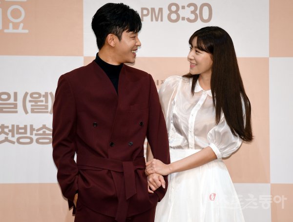 24일 서울 신도림 라마다호텔에서 열린 KBS1 일일드라마 ‘꽃길만 걸어요’ 제작발표회에 참석한 설정환과 최윤소가 카메라를 향해 포즈를 취하고 있다.