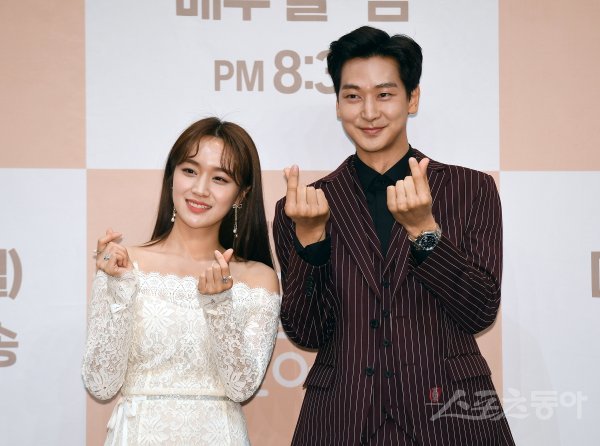 24일 서울 신도림 라마다호텔에서 열린 KBS1 일일드라마 ‘꽃길만 걸어요’ 제작발표회에 참석한 정유민과 심지호가 카메라를 향해 포즈를 취하고 있다.