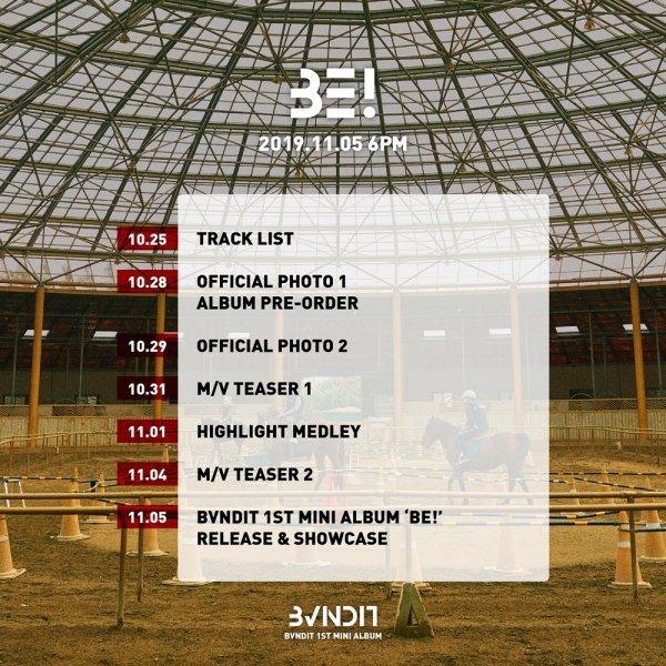 BVNDIT(이연, 송희, 정우, 시명, 승은)는 24일 0시 공식 SNS 계정을 통해 첫 번째 미니앨범 ‘BE!’ 프로모션 타임테이블 이미지를 업로드했다.