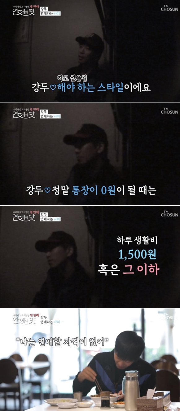 통장 잔고가 0원인 때도 있었다고. 강두는 “일도 없도 돈도 없었다. 진짜 그만해야 하나 싶었다. 하루 생활비로 1500원을 쓰거나 아예 안 쓰는 날도 있었다”며 “연애를 하고 싶지만 포기한 이유는 내가 연애할 자격이 없어서”고 고백했다. 그는 “한 달에 30만원도 못 번 적도 있다. 이 정도 벌고 쓰는 내가 무슨 연애를 하나 싶었다. 말이 안 되니까 포기했다”고 말했다.