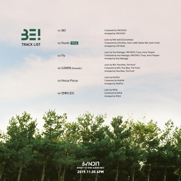 BVNDIT(이연, 송희, 정우, 시명, 승은)는 25일 0시 공식 SNS 계정을 통해 첫 번째 미니앨범 ‘BE!’ 트랙리스트 이미지를 업로드했다.