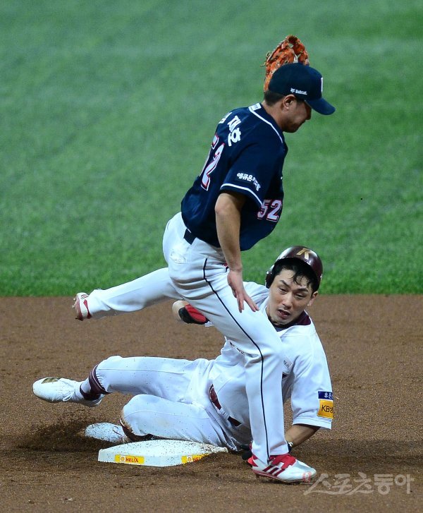 1회말 무사 1루 상황에서 1루주자 키움 서건창이 2루 도루를 시도했으나 아웃되고 있다.