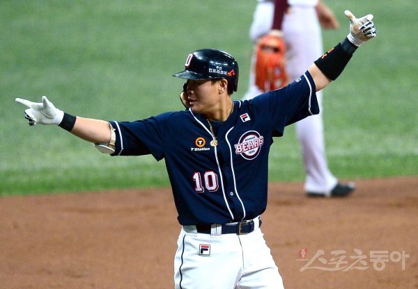 3회초 무사 1루 두산 박세혁이 선제 1타점 우전 3루타를 치고 3루에서 기뻐하고 있다.