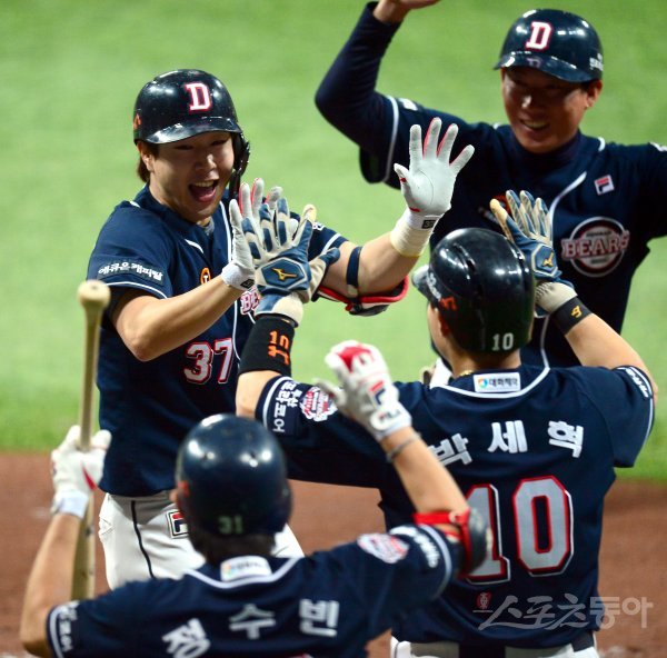3회초 무사 3루 두산 박건우가 좌월 투런 홈런을 날리고 그라운드를 돌아 홈인해 하이파이브 하고 있다.