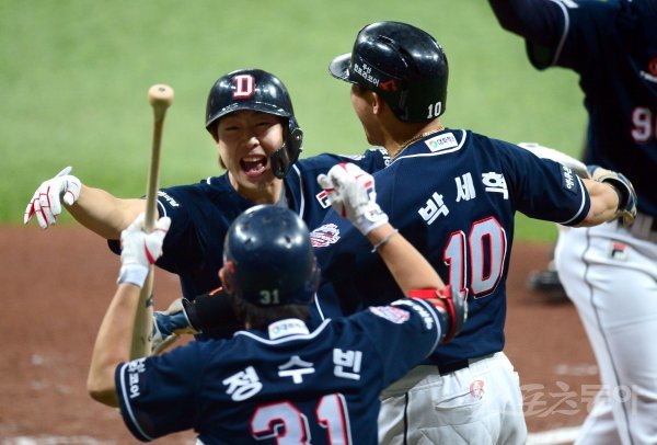 3회초 무사 3루 두산 박건우가 좌월 투런 홈런을 날리고 그라운드를 돌아 홈인해 하이파이브 하고 있다.