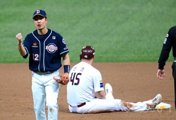7회말 무사 만루 키움 외야 뜬공 때 두산 김재호가 2루주자 샌즈를 아웃시킨 후 기뻐하고 있다.