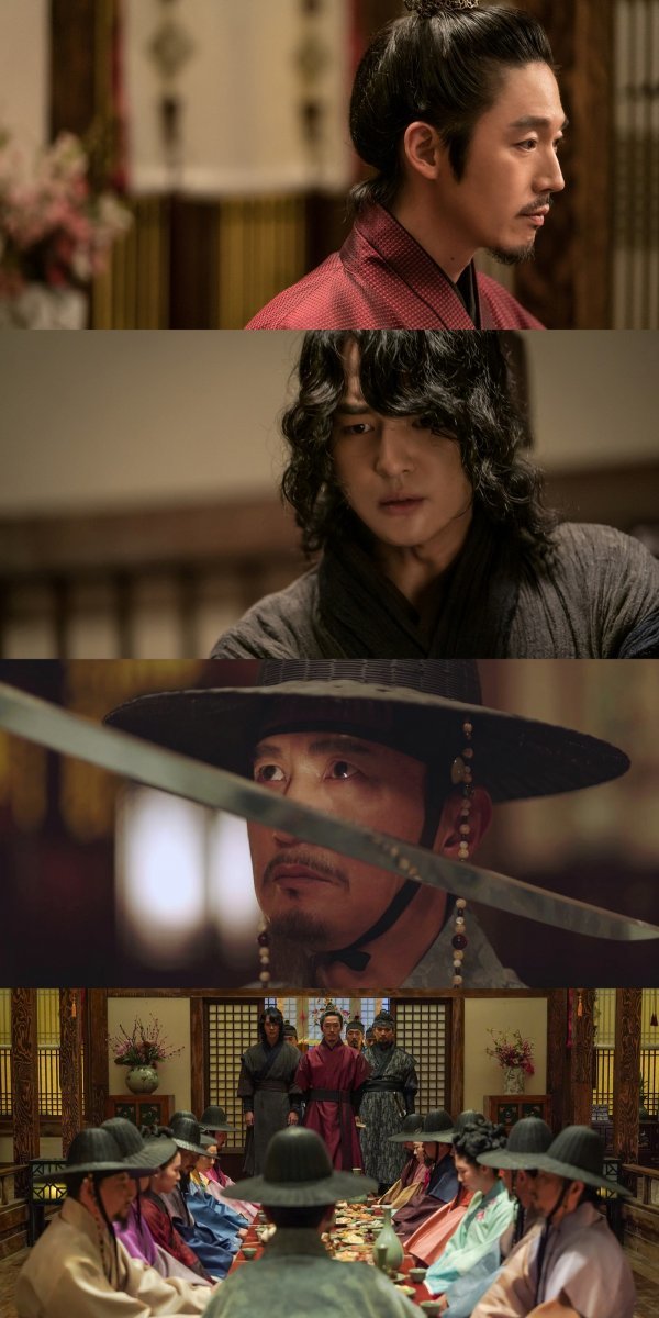 물러설 수 없는 벼랑 끝에 몰린 이방원과 남전은 외길에서 피할 수 없는 대결을 펼친다. 남전과 신하들이 모인 연회자리에 이방원이 사병을 이끌고 등장하면서 분위기는 일촉즉발의 위기로 흘러간다. 서슬 퍼런 눈빛으로 남전을 겨누는 이방원은 속을 읽을 수 없는 포커페이스 안에 날 선 얼굴을 숨기고 있다. 턱끝까지 다가온 칼 앞에서도 흔들리지 않는 남전의 표정은 긴장의 시위를 팽팽하게 당긴다. 이방원의 칼이자 남전의 간자로서 둘 사이에 끼어든 서휘의 표정도 의미심장하다. 세 사람은 과연 어떤 선택으로 극을 격동하게 할지 궁금증을 자극한다.