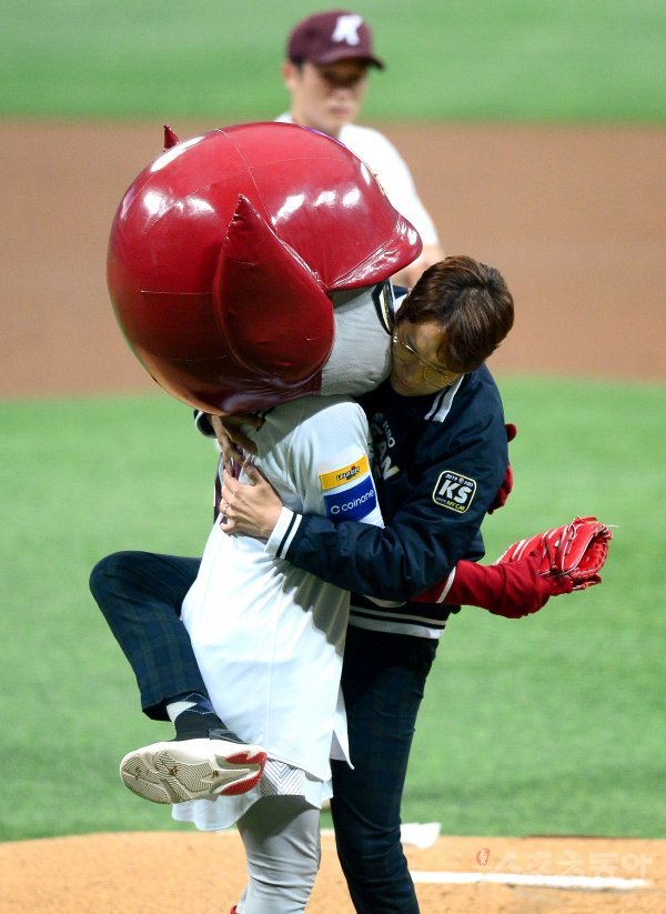 26일 서울 고척스카이돔에서 ‘2019 신한은행 MY CAR KBO 포스트시즌’ 두산 베어스와 키움 히어로즈의 한국시리즈 4차전이 열렸다. 경기 전 방송인 장성규가 시구에 앞서 턱돌이와 포웅하고 있다.