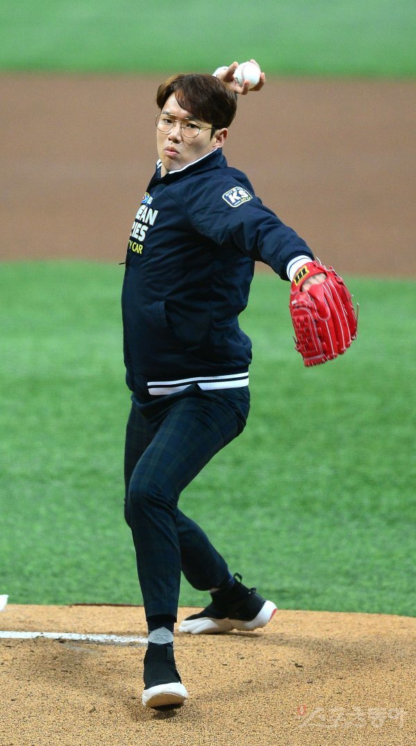 26일 서울 고척스카이돔에서 ‘2019 신한은행 MY CAR KBO 포스트시즌’ 두산 베어스와 키움 히어로즈의 한국시리즈 4차전이 열렸다. 경기 전 방송인 장성규가 시구를 하고 있다.