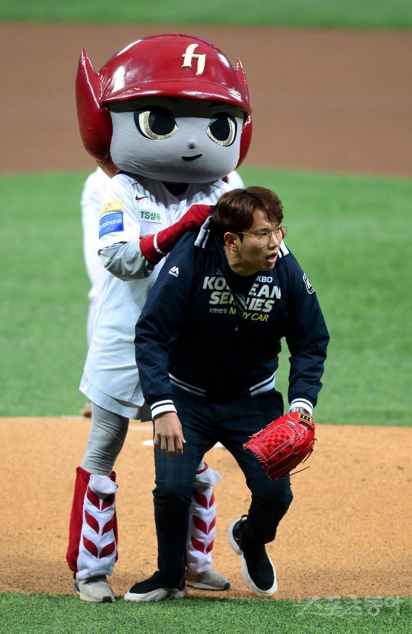 26일 서울 고척스카이돔에서 ‘2019 신한은행 MY CAR KBO 포스트시즌’ 두산 베어스와 키움 히어로즈의 한국시리즈 4차전이 열렸다. 경기 전 방송인 장성규가 시구를 마치고 아쉬워하고 있다.