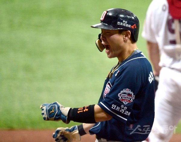 26일 서울 고척스카이돔에서 ‘2019 신한은행 MY CAR KBO 포스트시즌’ 두산 베어스와 키움 히어로즈의 한국시리즈 4차전이 열렸다. 2회초 2사 2루 두산 허경민의 적시타 때 득점한 박세혁이 환호하고 있다.