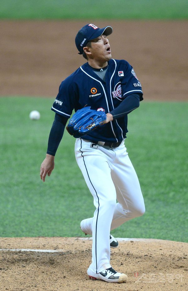 26일 서울 고척스카이돔에서 ‘2019 신한은행 MY CAR KBO 포스트시즌’ 두산 베어스와 키움 히어로즈의 한국시리즈 4차전이 열렸다. 두산 김승회가 2회말 2사 만루 키움 이지영에게 2타점 적시타를 허용하고 있다.
