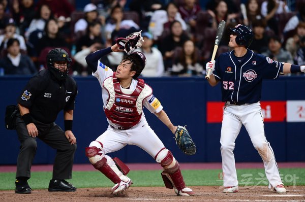 26일 서울 고척스카이돔에서 ‘2019 신한은행 MY CAR KBO 포스트시즌’ 한국시리즈 4차전 두산 베어스와 키움 히어로즈의 경기가 열렸다. 키움 포수 이지영이 5회초 1사 만루에서 안우진의 폭투를 잡기 위해 달려가고 있다.