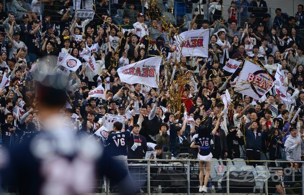 26일 서울 고척스카이돔에서 ‘2019 신한은행 MY CAR KBO 포스트시즌’ 한국시리즈 4차전 두산 베어스와 키움 히어로즈의 경기가 열렸다. 두산 응원단이 5회초 2사 만루에서 오재원의 역전 2타점 적시타가 나오자 환호하고 있다.