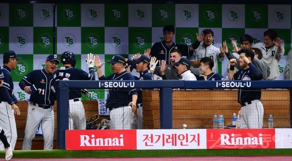 26일 서울 고척스카이돔에서 ‘2019 신한은행 MY CAR KBO 포스트시즌’ 한국시리즈 4차전 두산 베어스와 키움 히어로즈의 경기가 열렸다. 두산 덕아웃 선수들이 5회초 2사 만루에서 역전 2타점 적시타 때 홈을 밟은 선수들을 반갑게 맞이하고 있다.