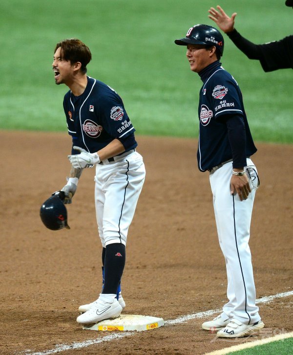 26일 서울 고척스카이돔에서 ‘2019 신한은행 MY CAR KBO 포스트시즌’ 두산 베어스와 키움 히어로즈의 한국시리즈 4차전이 열렸다. 5회초 2사 만루 두산 오재원이 역전 2타점 적시타를 치고 1루에서 환호하고 있다.