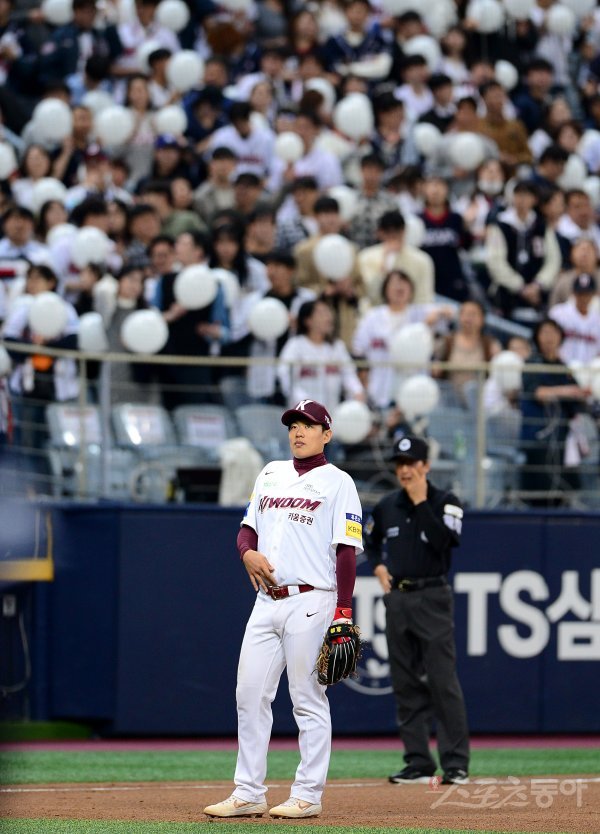 26일 서울 고척스카이돔에서 ‘2019 신한은행 MY CAR KBO 포스트시즌’ 한국시리즈 4차전 두산 베어스와 키움 히어로즈의 경기가 열렸다. 키움 송성문이 6회초 수비 중 두산 팬들의 야유를 듣고 고척돔 천장을 응시하고 있다.