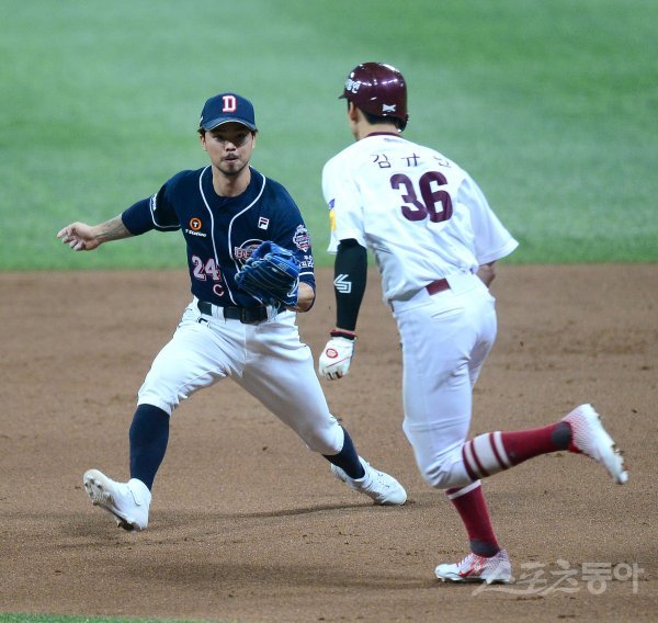 26일 서울 고척스카이돔에서 ‘2019 신한은행 MY CAR KBO 포스트시즌’ 두산 베어스와 키움 히어로즈의 한국시리즈 4차전이 열렸다. 7회말 1사 1루 키움 서건창 내야 땅볼 때 두산 오재원이 타구를 잡아 1루주자를 태그 아웃시키고 있다.