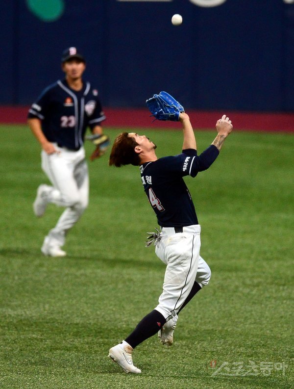 26일 서울 고척스카이돔에서 ‘2019 신한은행 MY CAR KBO 포스트시즌’ 두산 베어스와 키움 히어로즈의 한국시리즈 4차전이 열렸다. 8회말 무사 두산 오재원이 외야 깊숙한 곳의 뜬공을 잡아내고 있다.
