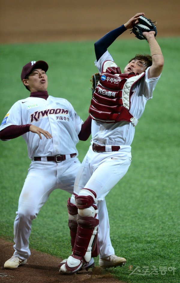 26일 서울 고척스카이돔에서 ‘2019 신한은행 MY CAR KBO 포스트시즌’ 두산 베어스와 키움 히어로즈의 한국시리즈 4차전이 열렸다. 8회초 2사 키움 이지영이 내야 뜬공을 잡으며 송성문과 충돌하고 있다.