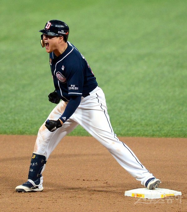 26일 서울 고척스카이돔에서 ‘2019 신한은행 MY CAR KBO 포스트시즌’ 두산 베어스와 키움 히어로즈의 한국시리즈 4차전이 열렸다. 연장 10회초 2사 3루 두산 오재일이 역전 1타점 우전 2루를 치자 더그아웃의 선수들이 환호하고 있다.