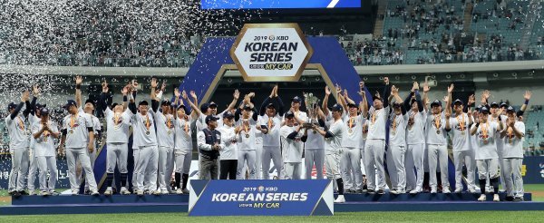 26일 서울 고척스카이돔에서 열린 ‘2019 신한은행 MY CAR KBO 포스트시즌’ 한국시리즈 4차전 두산 베어스와 키움 히어로즈의 경기에서 두산이 연장 접전 끝에 11-9로 승리, 시리즈 전적 4승으로 한국시리즈 여섯 번째 우승과 함께 통산 세 번째 통합 우승을 이뤄냈다. 두산 김태형 감독과 주장 오재원이 한국시리즈 우승 트로피를 전달 받고 있다.