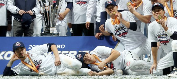 26일 서울 고척스카이돔에서 열린 ‘2019 신한은행 MY CAR KBO 포스트시즌’ 한국시리즈 4차전 두산 베어스와 키움 히어로즈의 경기에서 두산이 연장 접전 끝에 11-9로 승리, 시리즈 전적 4승으로 한국시리즈 여섯 번째 우승과 함께 통산 세 번째 통합 우승을 이뤄냈다. 두산 오재원과 박건우(오른쪽)이 익살스러운 포즈로 기념촬영을 하고 있다.