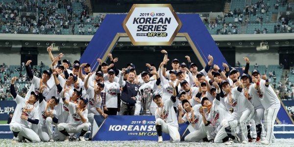 26일 서울 고척스카이돔에서 열린 ‘2019 신한은행 MY CAR KBO 포스트시즌’ 한국시리즈 4차전 두산 베어스와 키움 히어로즈의 경기에서 두산이 연장 접전 끝에 11-9로 승리, 시리즈 전적 4승으로 한국시리즈 여섯 번째 우승과 함께 통산 세 번째 통합 우승을 이뤄냈다. 두산 박정원 회장(가운데), 김태형 감독을 비롯한 선수단 전원이 기념촬영을 하고 있다.