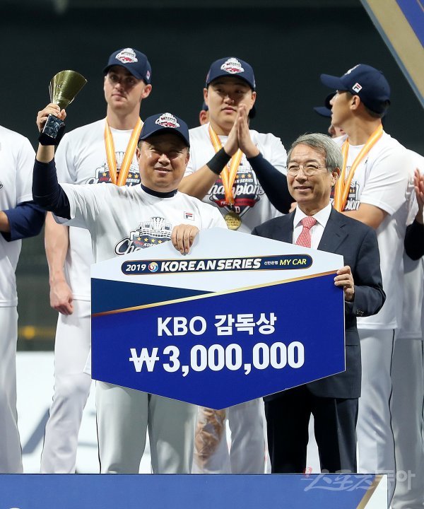 26일 서울 고척스카이돔에서 열린 ‘2019 신한은행 MY CAR KBO 포스트시즌’ 한국시리즈 4차전 두산 베어스와 키움 히어로즈의 경기에서 두산이 연장 접전 끝에 11-9로 승리, 시리즈 전적 4승으로 한국시리즈 여섯 번째 우승과 함께 통산 세 번째 통합 우승을 이뤄냈다. 두산 김태형 감독이 KBO 감독상에 선정된 후 정운찬 KBO 총재(오른쪽)와 기념촬영을 하고 있다.