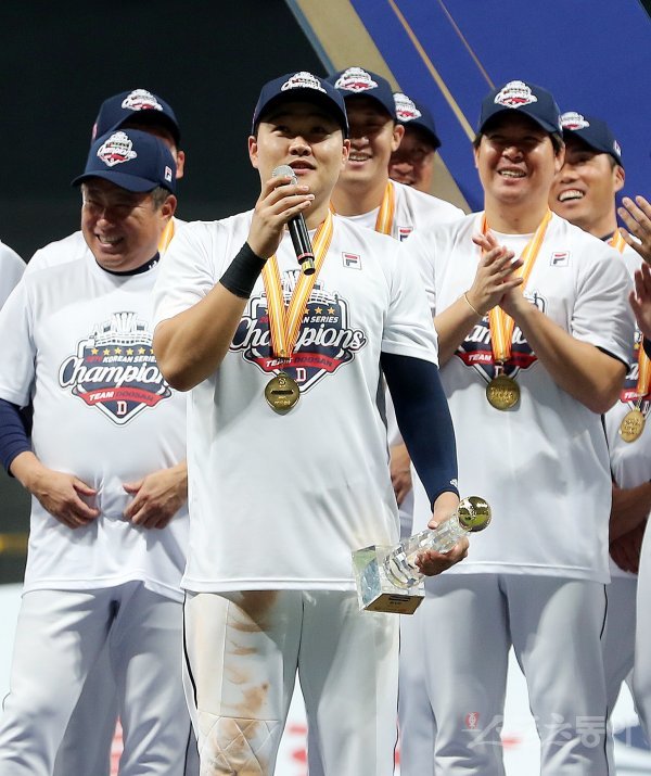 26일 서울 고척스카이돔에서 열린 ‘2019 신한은행 MY CAR KBO 포스트시즌’ 한국시리즈 4차전 두산 베어스와 키움 히어로즈의 경기에서 두산이 연장 접전 끝에 11-9로 승리, 시리즈 전적 4승으로 한국시리즈 여섯 번째 우승과 함께 통산 세 번째 통합 우승을 이뤄냈다. 두산 오재일이 한국시리즈 MVP에 선정된 후 소감을 밝히고 있다.