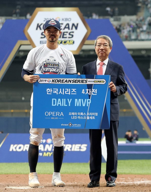 26일 서울 고척스카이돔에서 열린 ‘2019 신한은행 MY CAR KBO 포스트시즌’ 한국시리즈 4차전 두산 베어스와 키움 히어로즈의 경기에서 두산이 연장 접전 끝에 11-9로 승리, 시리즈 전적 4승으로 한국시리즈 여섯 번째 우승과 함께 통산 세 번째 통합 우승을 이뤄냈다. 두산 오재원이 한국시리즈 4차전 데일리 MVP에 선정된 후 정운찬 KBO 총재(오른쪽)와 기념촬영을 하고 있다.