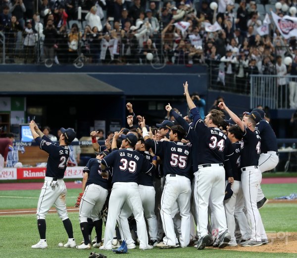 26일 서울 고척스카이돔에서 열린 ‘2019 신한은행 MY CAR KBO 포스트시즌’ 한국시리즈 4차전 두산 베어스와 키움 히어로즈의 경기에서 두산이 연장 접전 끝에 11-9로 승리, 시리즈 전적 4승으로 한국시리즈 여섯 번째 우승과 함께 통산 세 번째 통합 우승을 이뤄냈다. 두산 선수들이 경기 후 그라운드에서 기쁨의 셀카를 찍고 있다.