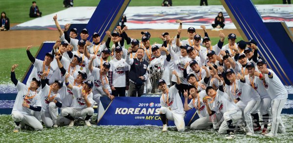 26일 서울 고척스카이돔에서 ‘2019 신한은행 MY CAR KBO 포스트시즌’ 두산 베어스와 키움 히어로즈의 한국시리즈 4차전이 열렸다. 두산이 11-9 역전승을 거두며 시리즈 전적 4승 무패로 통합우승을 차지했다. 선수들이 셀카 세리머니로 기념촬영을 하고 있다.