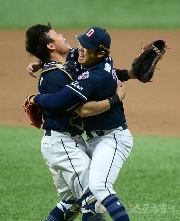 26일 서울 고척스카이돔에서 ‘2019 신한은행 MY CAR KBO 포스트시즌’ 두산 베어스와 키움 히어로즈의 한국시리즈 4차전이 열렸다. 두산이 11-9 역전승을 거두며 시리즈 전적 4승 무패로 통합우승을 차지했다. 두산 박세혁과 배영수가 환호하고 있다.