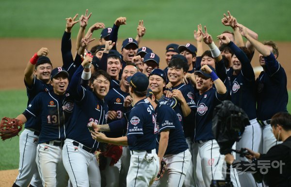 26일 서울 고척스카이돔에서 ‘2019 신한은행 MY CAR KBO 포스트시즌’ 두산 베어스와 키움 히어로즈의 한국시리즈 4차전이 열렸다. 두산이 11-9 역전승을 거두며 시리즈 전적 4승 무패로 통합우승을 차지했다. 선수들이 환호하고 있다.