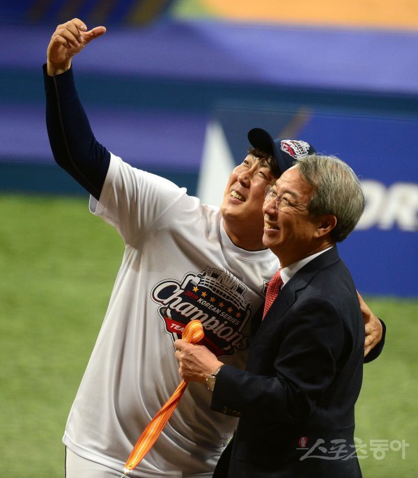 26일 서울 고척스카이돔에서 ‘2019 신한은행 MY CAR KBO 포스트시즌’ 두산 베어스와 키움 히어로즈의 한국시리즈 4차전이 열렸다. 두산이 11-9 역전승을 거두며 시리즈 전적 4승 무패로 통합우승을 차지했다. 배영수가 정운찬 KBO 총재와 셀카 세리머니를 하고 있다.