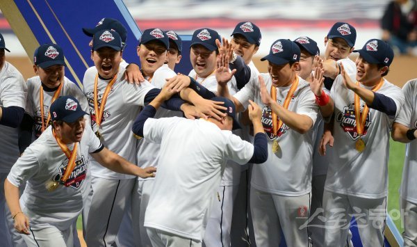 26일 서울 고척스카이돔에서 ‘2019 신한은행 MY CAR KBO 포스트시즌’ 두산 베어스와 키움 히어로즈의 한국시리즈 4차전이 열렸다. 두산이 11-9 역전승을 거두며 시리즈 전적 4승 무패로 통합우승을 차지했다. 우승 메달을 받은 김태형 감독이 선수들에게 축하를 받고 있다.