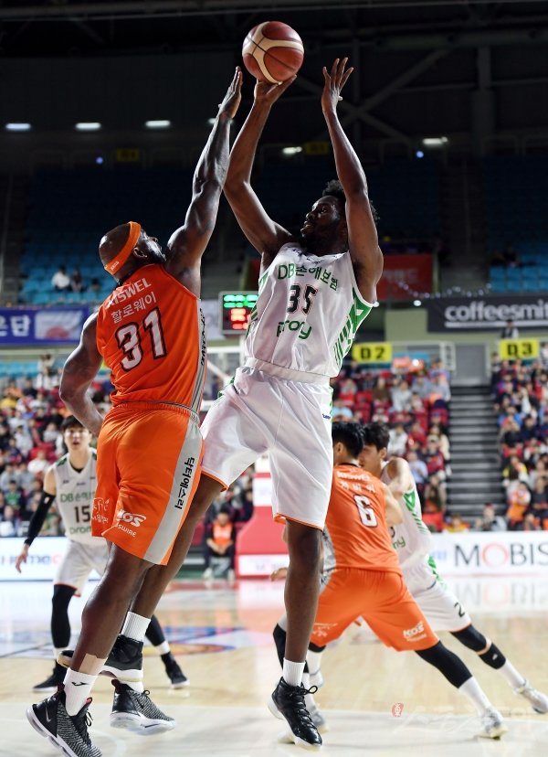 27일 인천 삼산월드체육관에서 열린 ‘2019-2020 현대모비스 프로농구’ 인천 전자랜드와 원주 DB의 경기에서 DB 오누아쿠가 전자랜드 할로웨이의 수비를 피해 슛을 쏘고 있다.