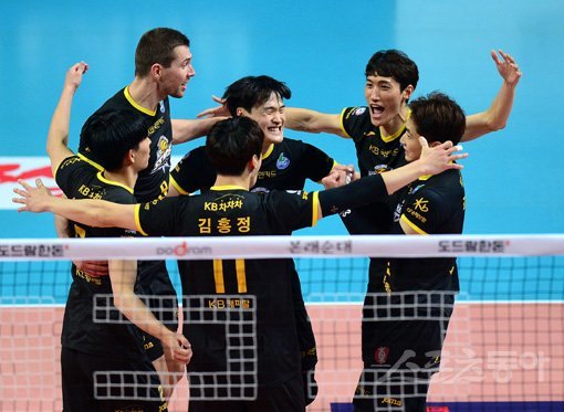 27일 서울 장충체육관에서 열린 ‘도드람 2019~2020 V-리그‘ 남자부 KB손해보험과 우리카드 경기에서 KB손해보험 김정호가 득점에 성공한 후 기뻐하고 있다. 장충|김종원 기자 won@donga.com