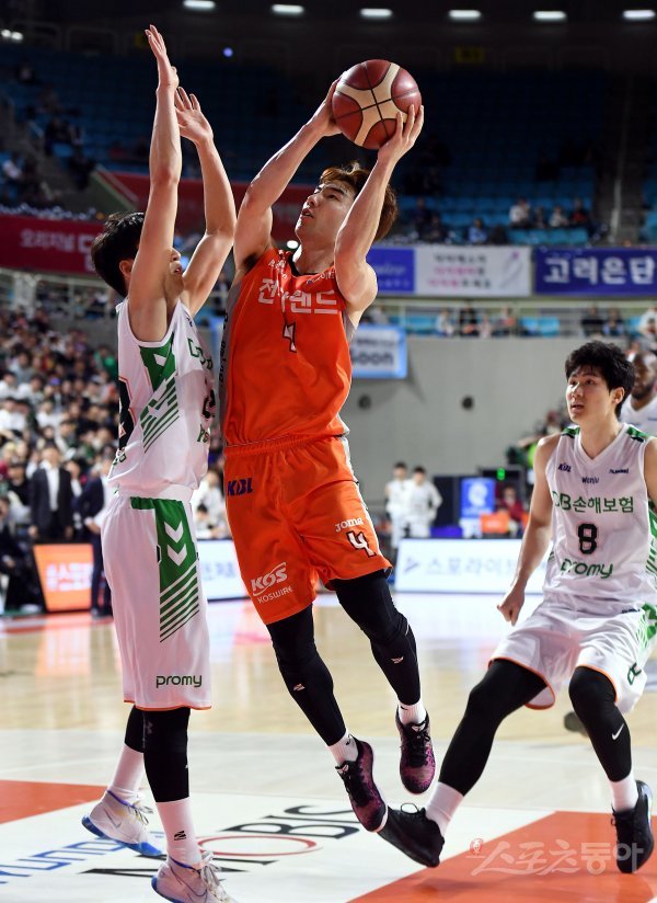 27일 인천 삼산월드체육관에서 열린 ‘2019-2020 현대모비스 프로농구’ 인천 전자랜드와 원주 DB의 경기에서 전자랜드 김낙현이 DB 김창모의 수비를 앞에두고 슛을 쏘고 있다.
